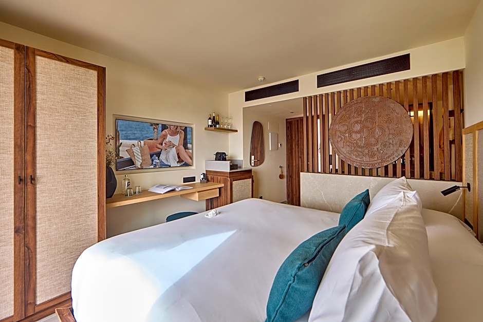 JUNIOR SUITE SEA VIEW JOY is 323 square feet and includes a queen-size bed 150-154 width.